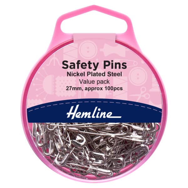 Hardened and tempered quality safety pins in a useful closable storage box. Nickel, 100 pieces. Size: 0, 27mm, 1 1/8in.