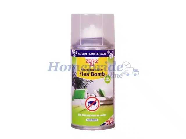 The Natural Insect Killer Flea Bomb 150ml from Zero In controls fleas, larvae and ticks in the home. The total release aerosol efficiently treats a whole room of up to 40m3 and is easy to use. Simply press on the trigger to lock it into place and then leave the room. Do not permit children or pets access to the room while the aerosol is being dispensed. Air the treated room fully before re-admitting. The one-shot aerosol works to kill insects on bedding, rugs and carpets in the home, breaking the flea breeding cycle and reducing re-infestation. There are no harmful residues left once the aerosol is dispensed. The Flea Bomb is safer and cleaner to use than incendiary smoke bombs. Targets a variety of household insects as well as fleas; such as flies, mosquitoes, ants, wasps, earwigs, silverfish, bedbugs, moths. Contains only natural pyrethrins and no chemicals or poisons.