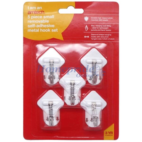 DURABLE: This 5 piece self-adhesive hanging hook set is made from high impact, white moulded ABS plastic with wire pivot hangers. 800g LOAD CAPACITY: With a maximum load capacity of 800g (1.8lb), these hooks with a sticky back are ideal for hanging items such as lightweight jackets and hand towels. DIMENSIONS: Each diamond-shaped coat hook is 3.4cm (1.3”) x 3.4cm (1.3”) in size.