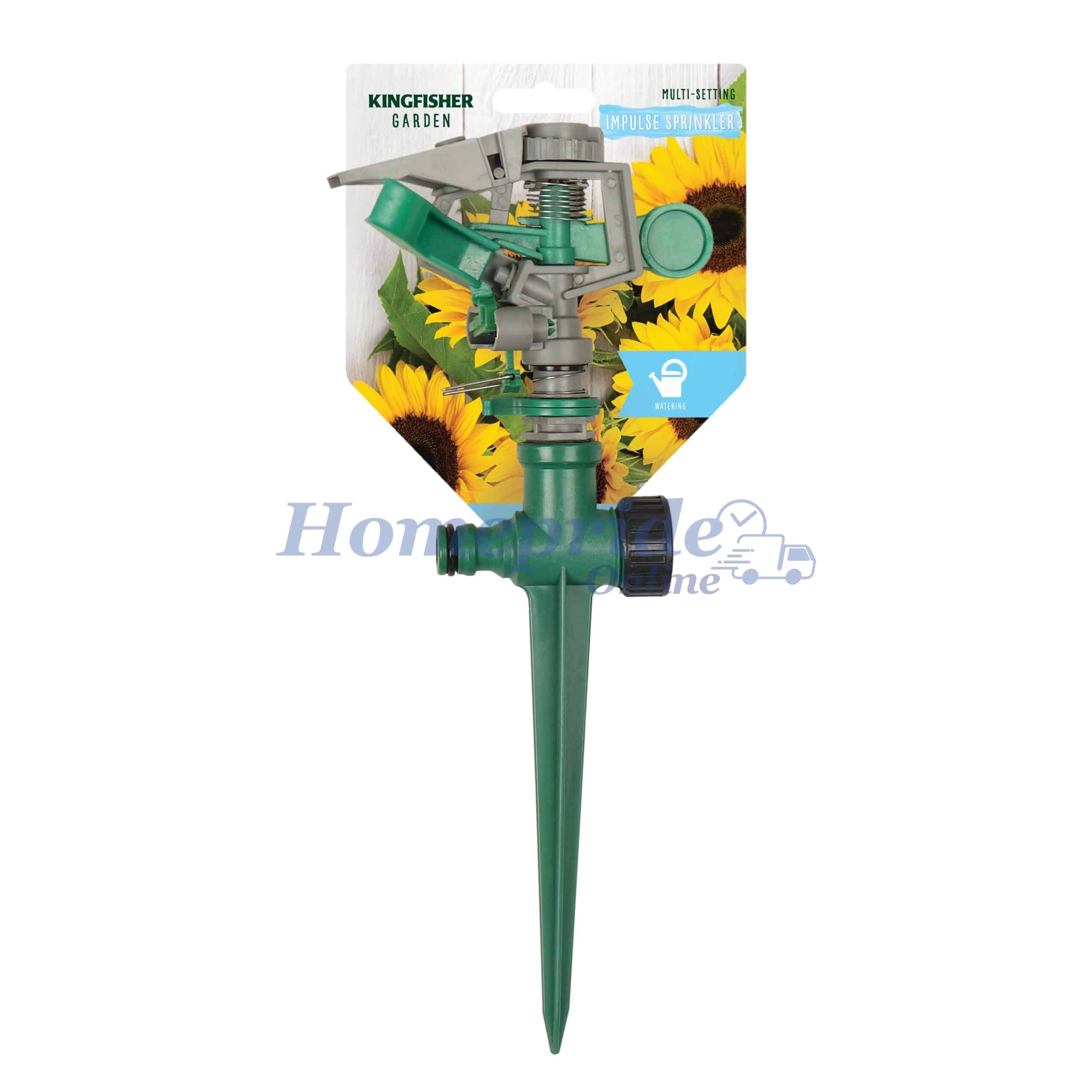 Impulse water sprinkler. Snap on hose connector and ground spike. Multiple settings. Packed with full colour header card.