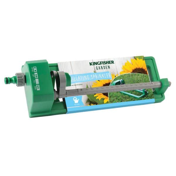 Oscillating sprinkler with snap on hose connector. 4 spray positions, covers up to 250sqm.